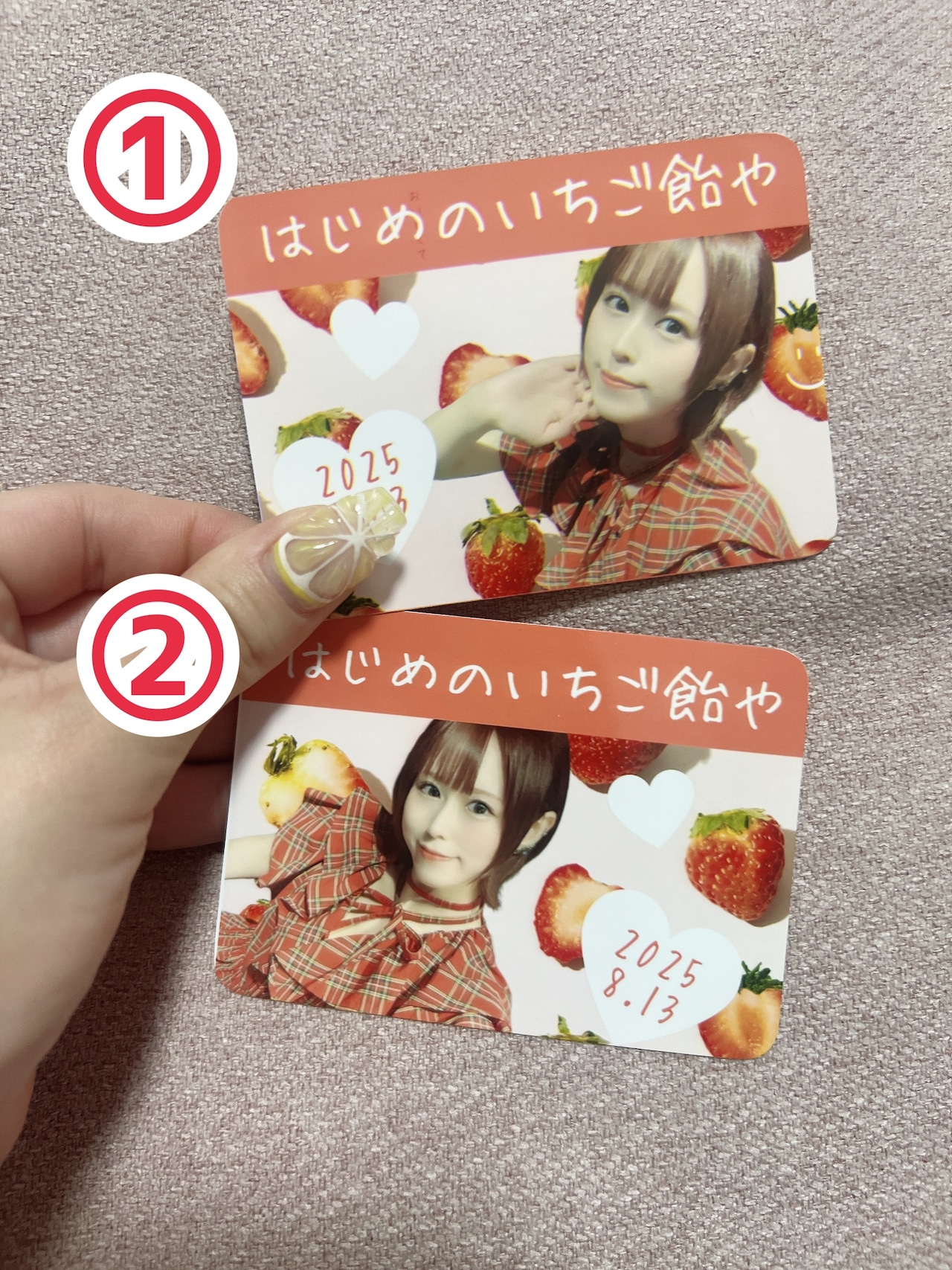 8/13のイベントで使用したいちご飴やさんの特典カード2種類。